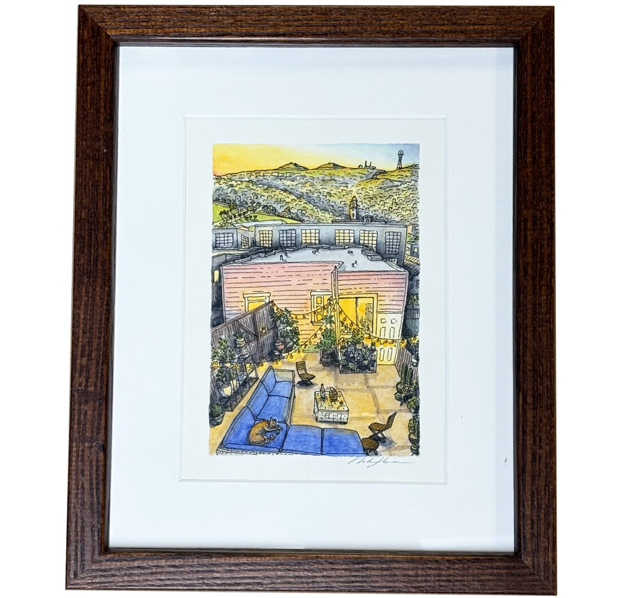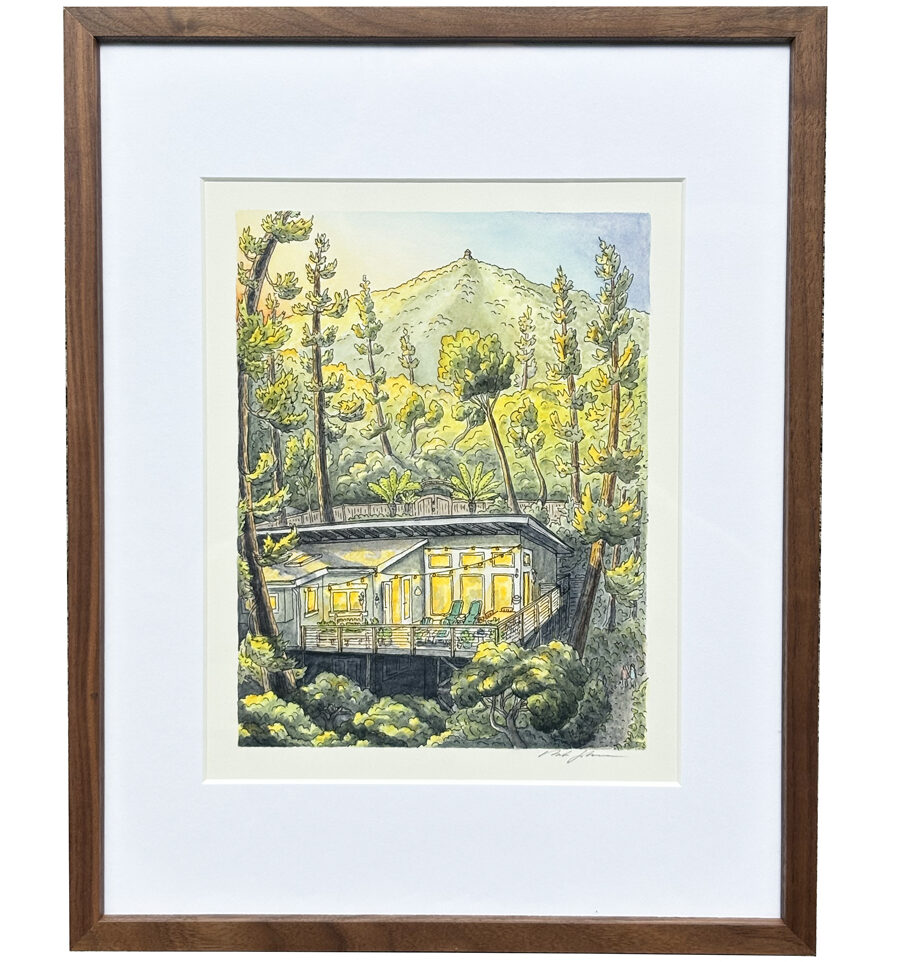 I work with the description and reference photos you provide to imaginatively pen and paint a scene that captures the essence of your special place. I may also reference views available from online maps, and if the location is nearby, I may make an in-person visit to get a better understanding of what it feels like to be present at your location. I focus on the feeling of the place, rather than attempting to adhere strictly to realism.