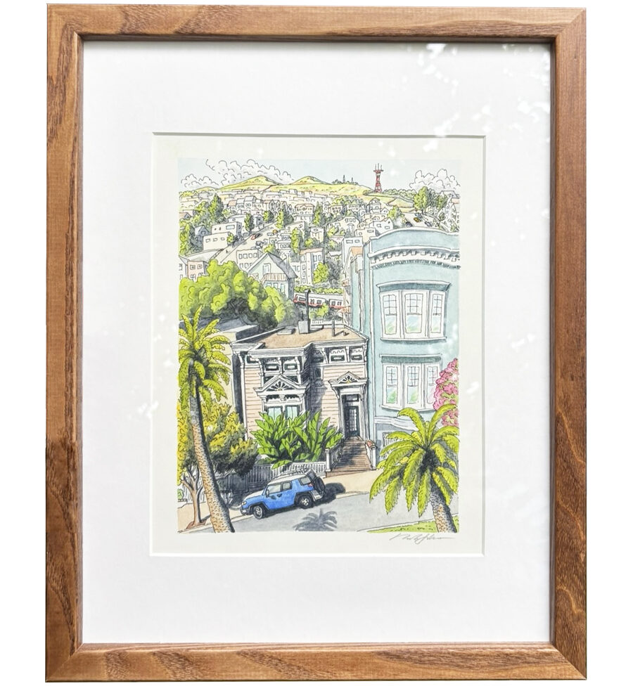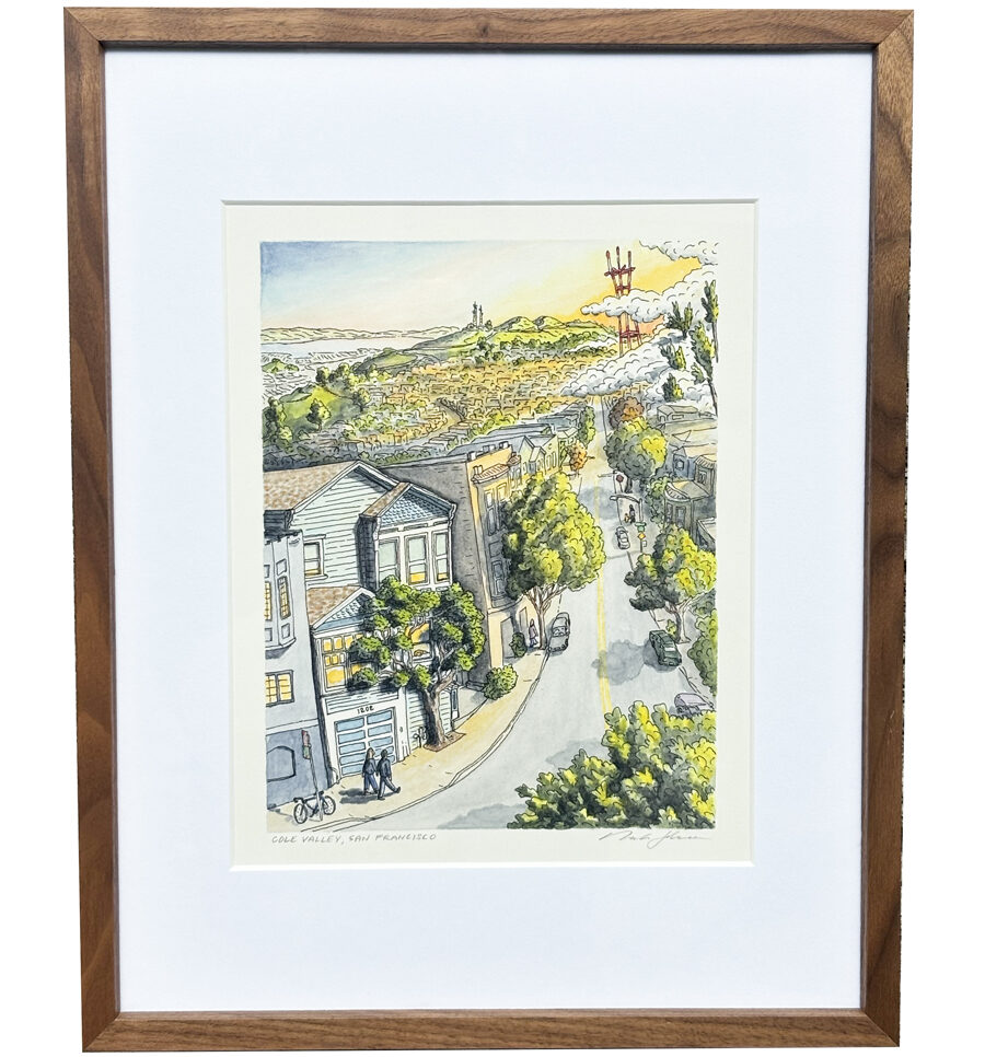 9″x12″ painting, framed with a window mat in a 16×20 wood frame.