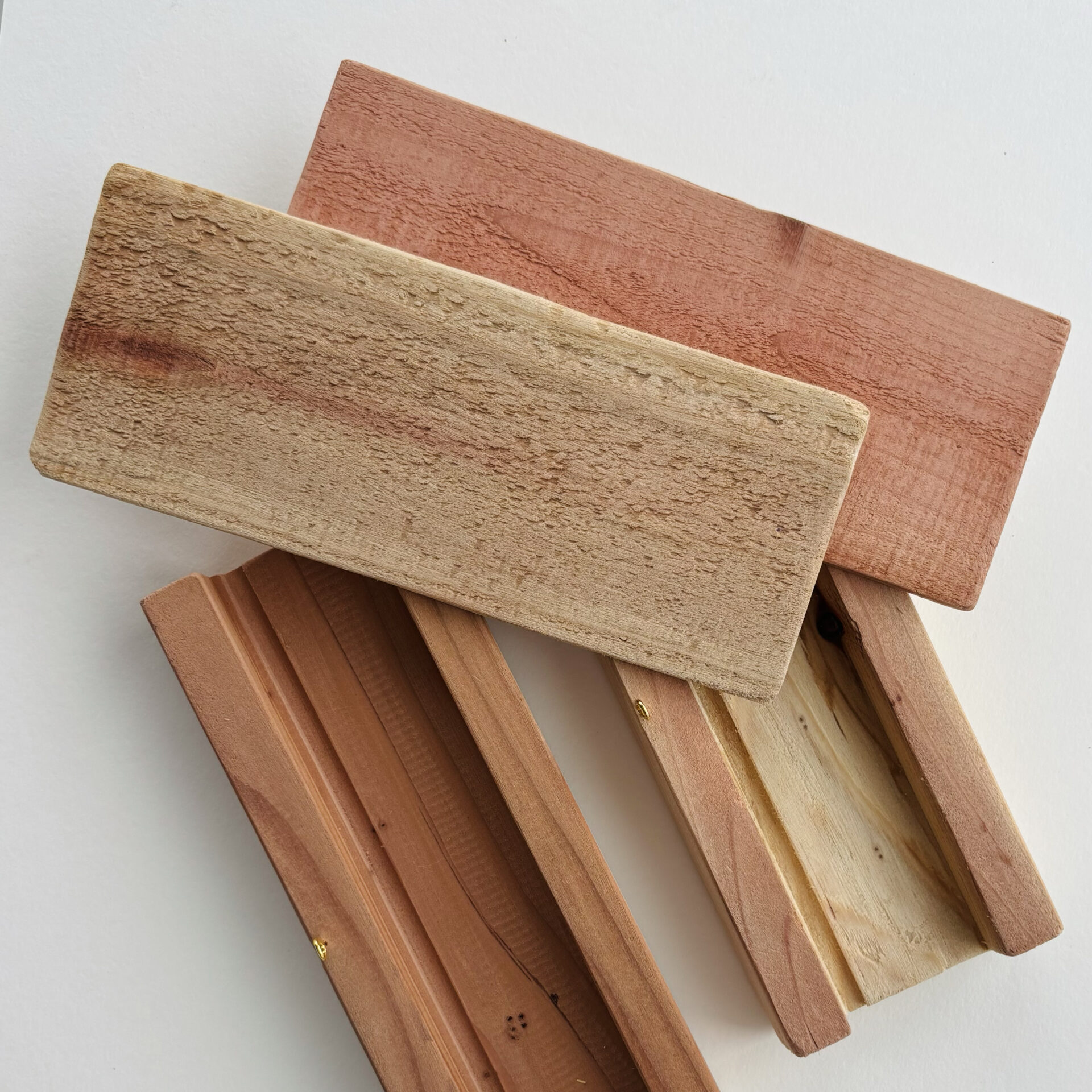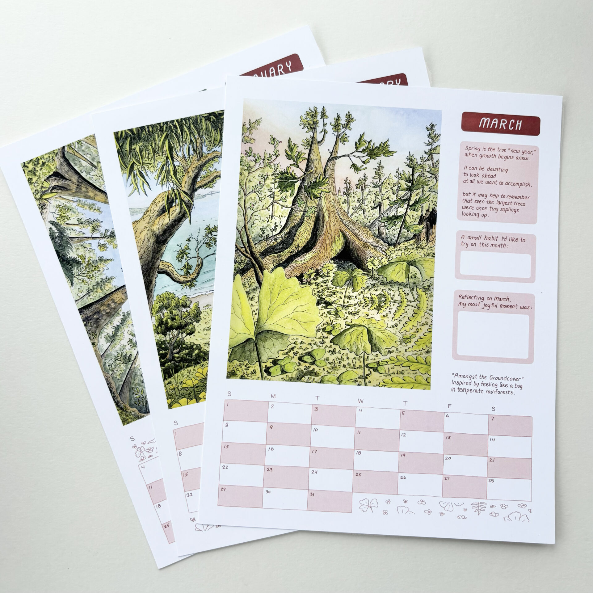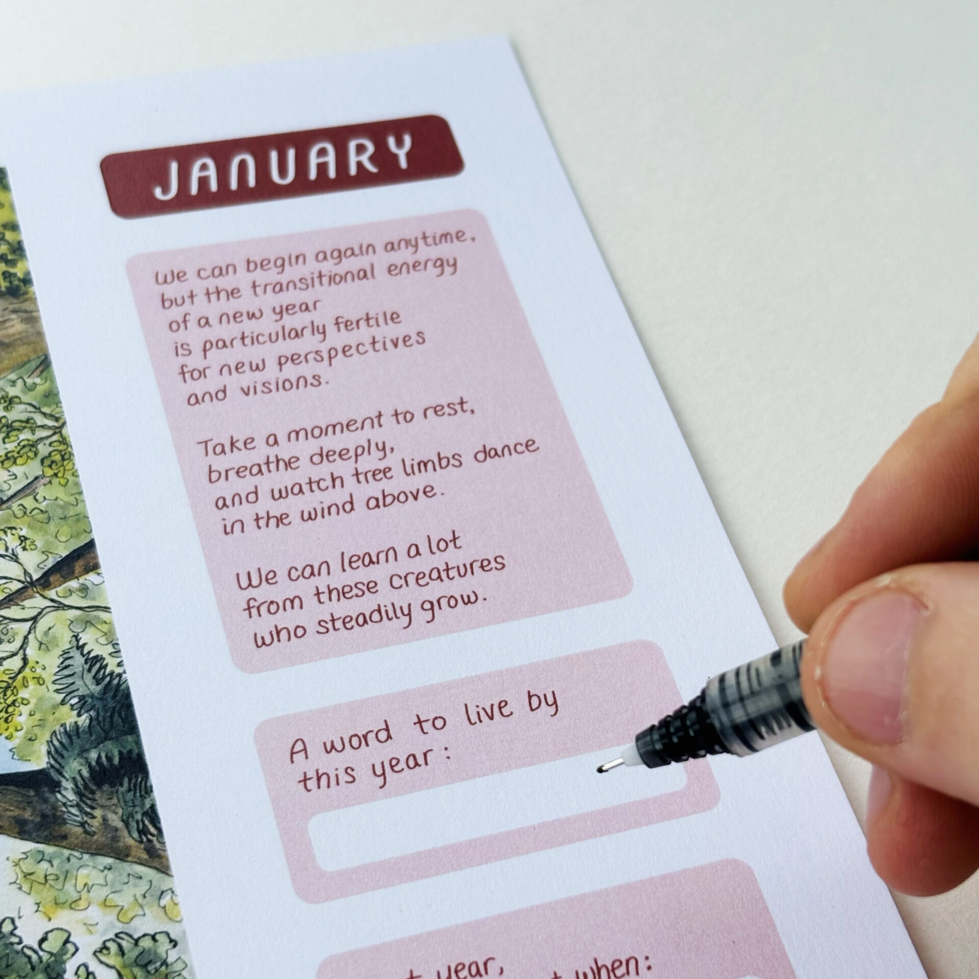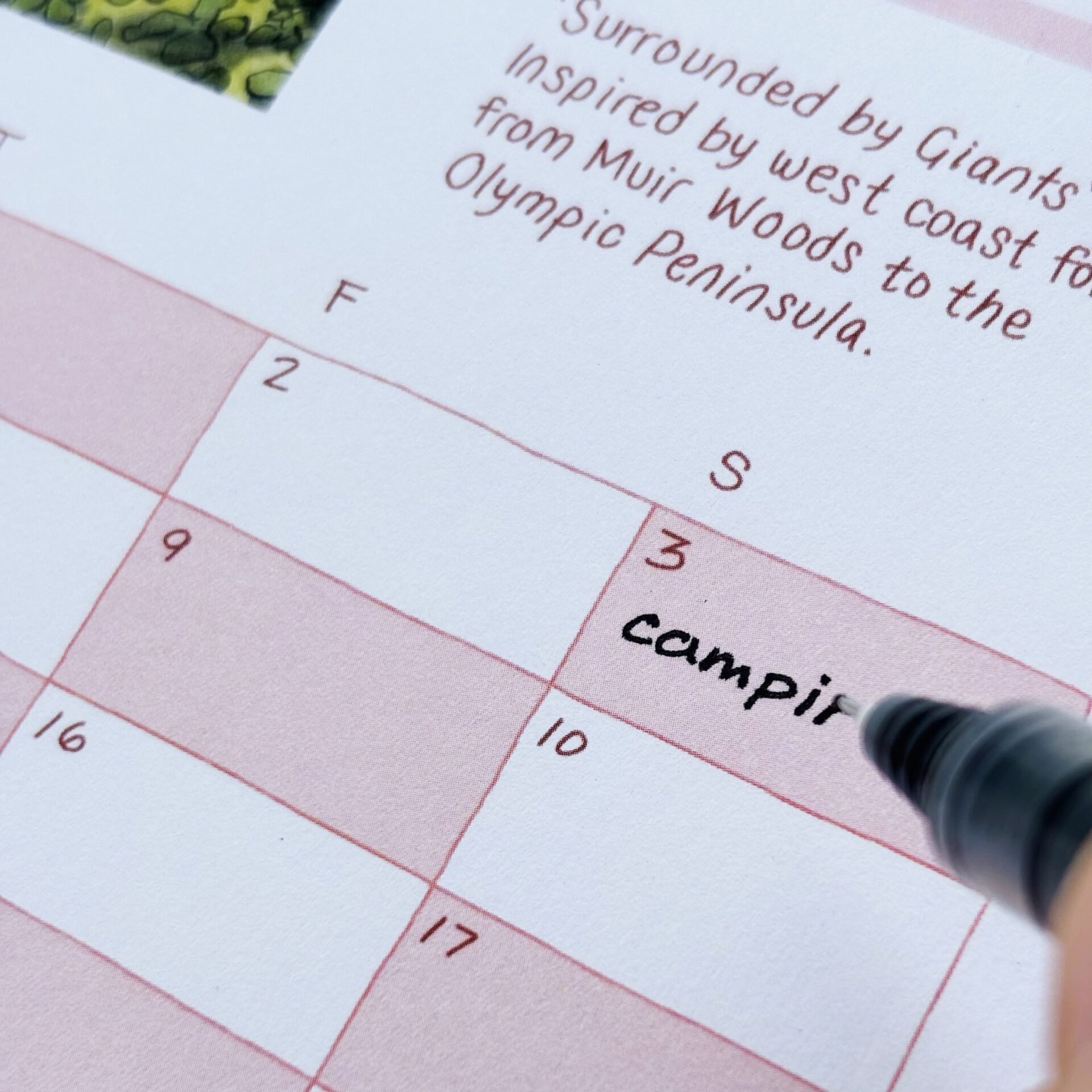 Enjoy a twelve-month calendar for 2026, from January through December, with a redwood base that can be either desk- or wall-mounted (using the provided nail). The base has room for your favorite trinkets and small found items that are special to you throughout the year (shells, leaves, flowers, rocks, and more!).