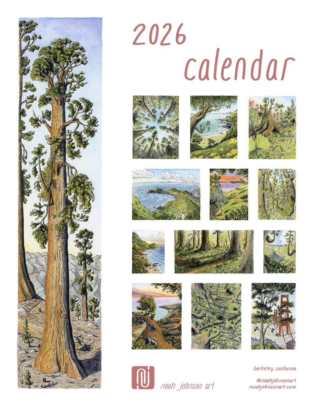 Each month’s design is printed on letter size (8-1/2″ x 11″) 100lb matte cardstock, and includes a 5″x7″ print on each page that you can cut out and use as wall art. (Please note, however, that the calendar prints are not archival-quality, and made fade over time, when compared to the more light-fast giclee prints that I offer).