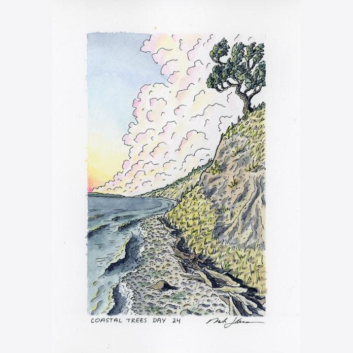 Day 24 of a 30-day series painting coastal trees, celebrating coastal trees and the confluence of land, sea, and tree. I search for play and awe in these places, encouraging us to remember how it felt to first encounter and share air with these great storytellers.