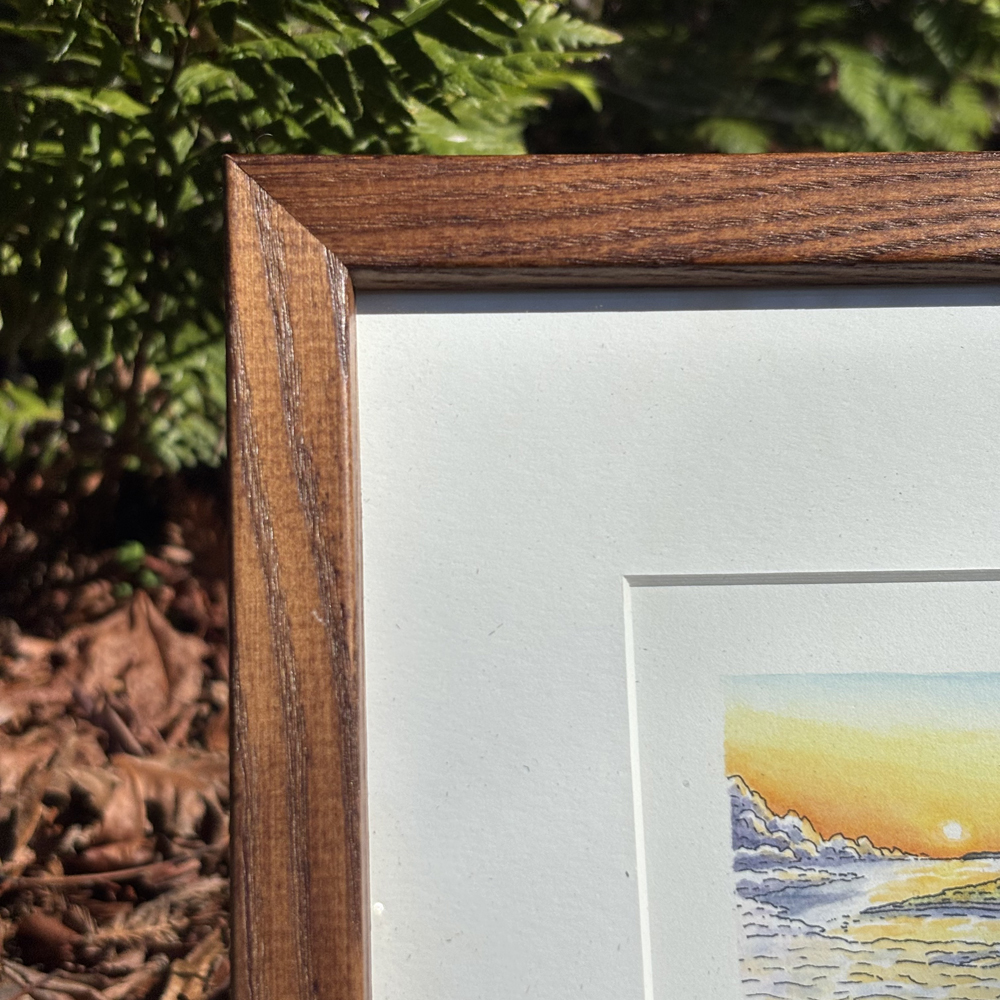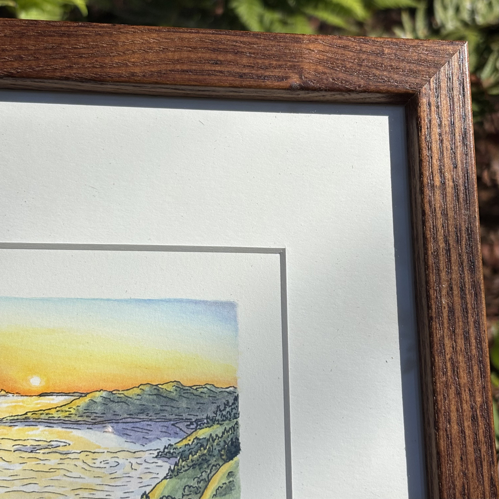This original artwork is framed with a window mat and backing in a 8″x10″ wood frame with regular glass glazing.