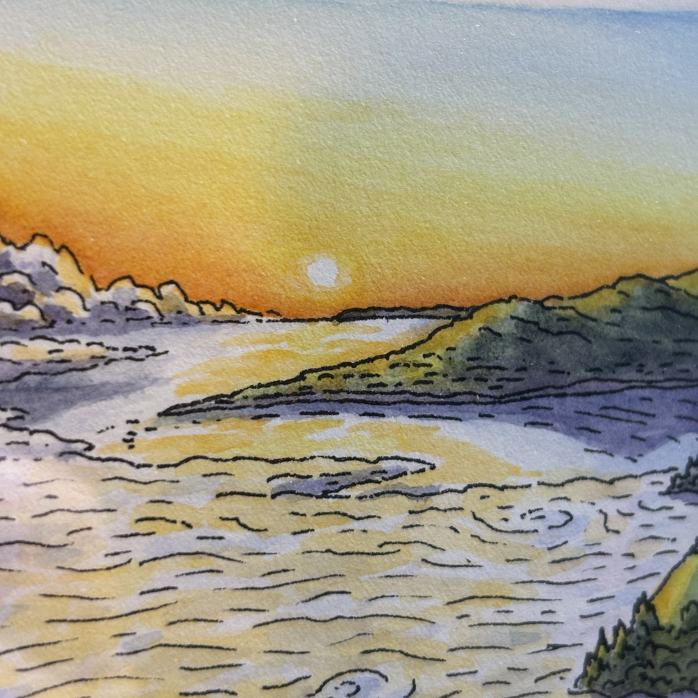 Drawn with permanent ink and painted with watercolor on hot press watercolor paper.